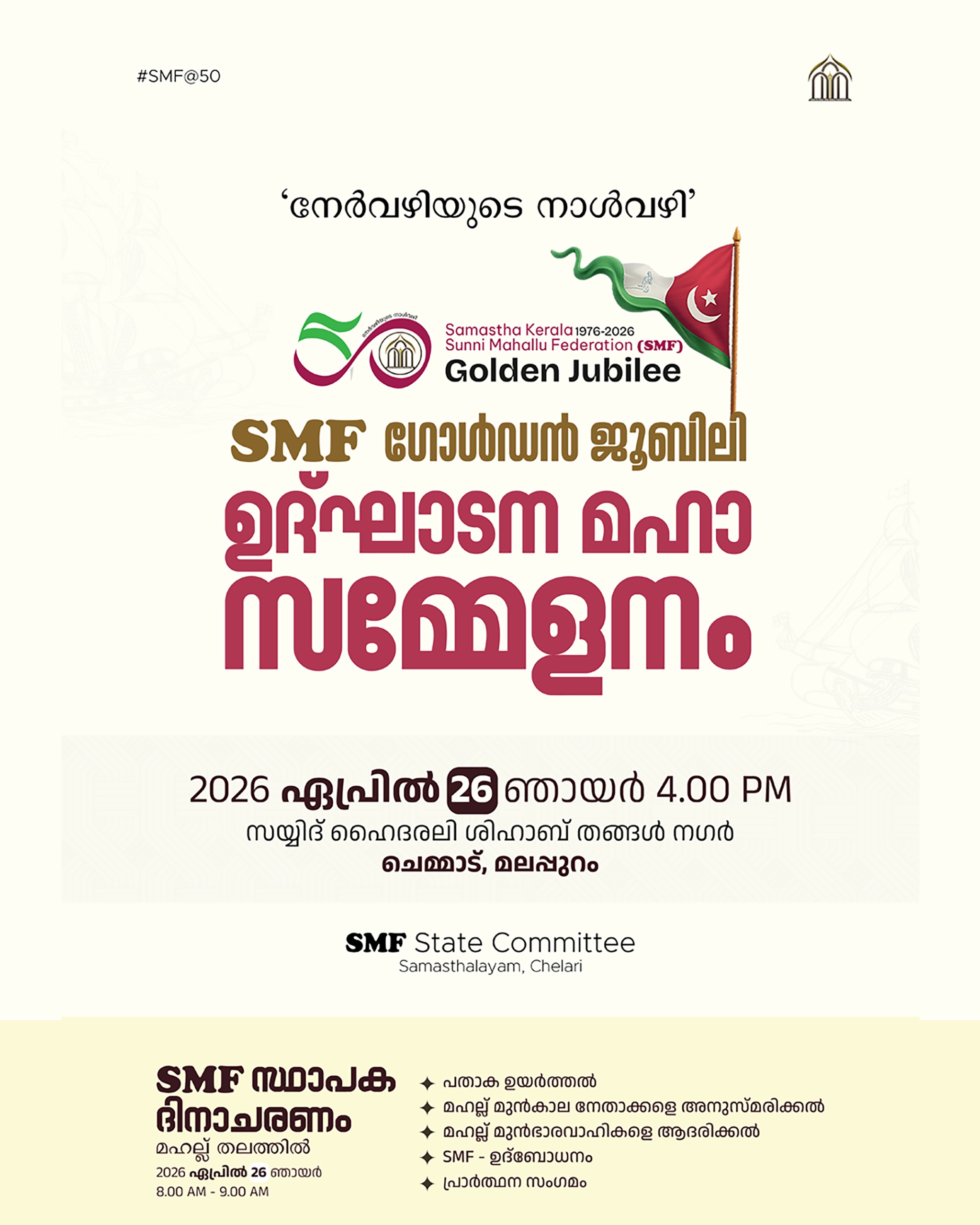 SMF ഗോൾഡൻ ജൂബിലി ആഘോഷങ്ങളുടെ ഭാഗമായി 2026 ഏപ്രിൽ 20-ന് നടത്താൻ നിശ്ചയിച്ചിരുന്ന സ്വാഗത സംഘം@ ബാംഗ്ലൂർ യോഗം, ഏപ്രിൽ 26-ന് നടക്കുന്ന ഉദ്ഘാടന മഹാസമ്മേളനത്തിന്റെ തിരക്കുകൾ മൂലം മാറ്റിവെച്ചിരിക്കുന്നതായി അറിയിക്കുന്നു. ഉദ്ഘാടന സമ്മേളനത്തിന് ശേഷം യോഗത്തിന്റെ പുതിയ തീയതി പിന്നീട് അറിയിക്കുന്നതാണ്. ... Read More